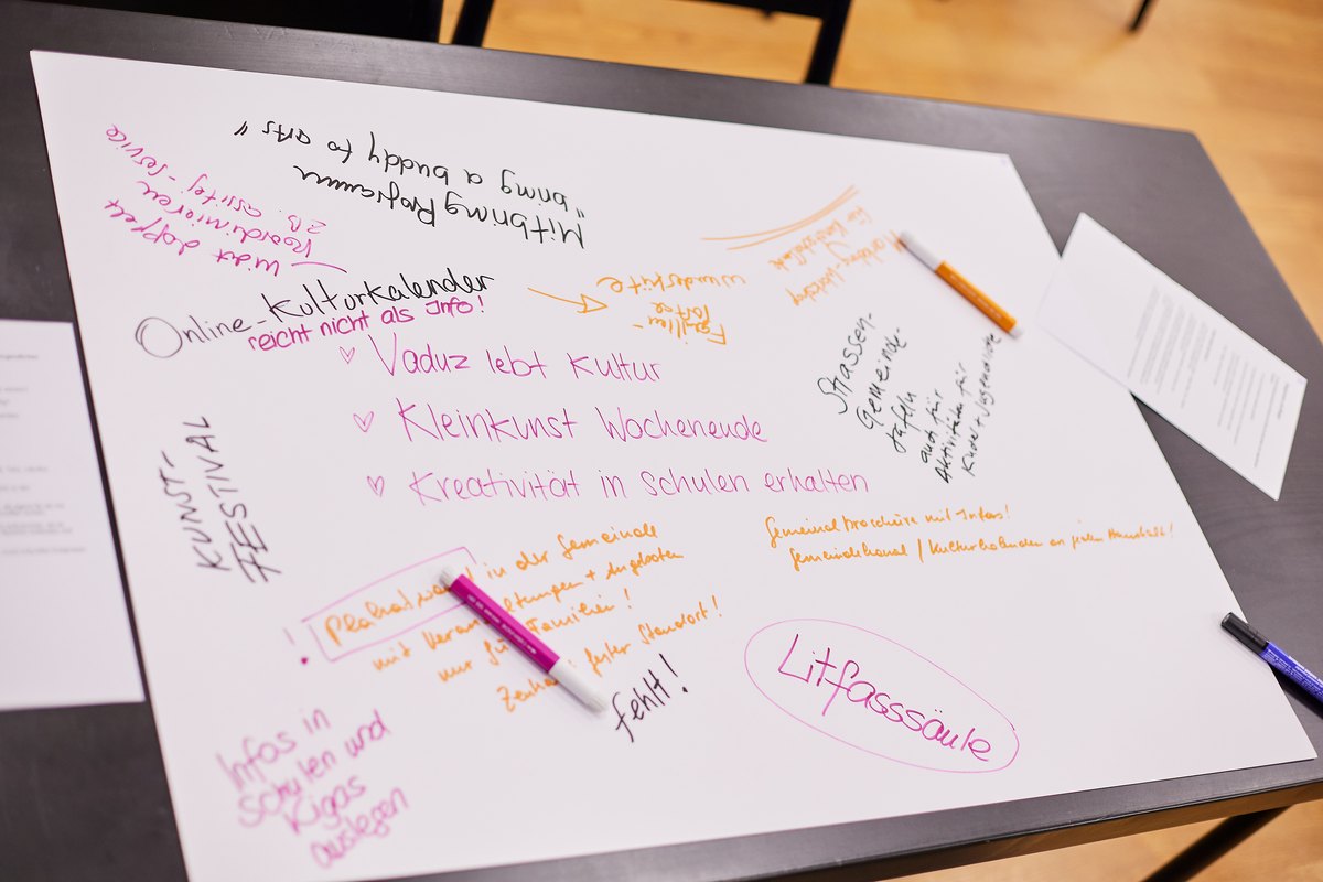 Der anschliessende Ideenaustausch von Kunstschaffenden, Verantwortlichen aus Kultur und Politik, Eltern und Lehrpersonen im Kunstmuseum bildete den Auftakt zu einem ersten Netzwerk-Treffen. In Tischrunden, welche jeweils eine Forderung des Manifests thematisierten, wurden die kulturellen Angebote, der Stellenwert, den Kunst und Kultur für Kinder und Jugendliche in der Gemeinde hat, Finanzierungsmöglichkeiten sowie Wünsche und Anregungen für eine kreative und inspirierende Kulturszene für Kinder und Jugendliche und Familien angeregt diskutiert. So fehlt es beispielsweise an Anlauf- und Beratungsstellen für Kunstschaffende oder auch einer öffentlichen Plattform sämtlicher Angebote für Kinder, Jugendliche und Familien. Die Frage, wie der Wert der Künste und der Kreativität in der Gesellschaft und speziell in der Gemeinde verankert werden kann, beschäftige die Teilnehmenden ebenso wie das Zusammenspiel von Bildung und Kultur. Als beispielhaft wurde der Kulturgutschein der Gemeinde Vaduz für alle Generationen benannt, der es auch einkommensschwachen Familien ermöglicht, am kulturellen Leben teilzunehmen. Kulturelle Bildung ist Allgemeinbildung mit den Mitteln der Künste und sollte als wichtigen Einflussfaktor ernstgenommen werden. So wünschten sich die Teilnehmenden eine stärkere Vernetzung in den unterschiedlichsten Verantwortungsbereichen, sei es die Zusammenarbeit von Künstlern und Kulturvereinen und -institutionen mit Bildungsinstitutionen und auf politischer Ebene zwischen Bildungs- und Kulturministerium. Die Ergebnisse dieses ersten kreativen Austausches und aller weiteren Treffen des Netzwerkes, das nächste Treffen findet am 3. April 2023 in Ruggell statt, werden evaluiert, um die Anliegen, Wünsche, Anregungen aller Teilnehmenden sichtbar zu machen und um entsprechende Massnahmen zu ergreifen.