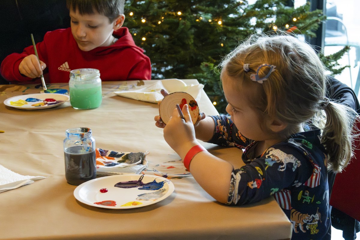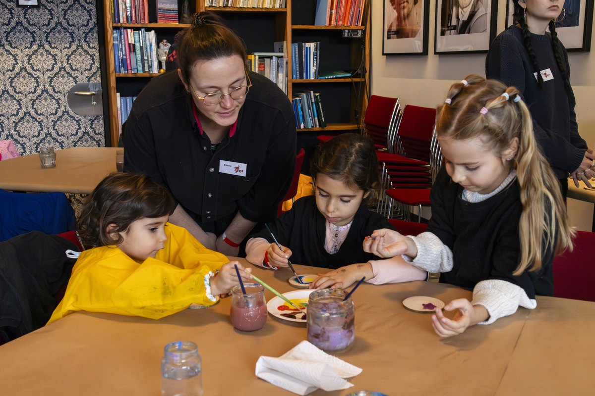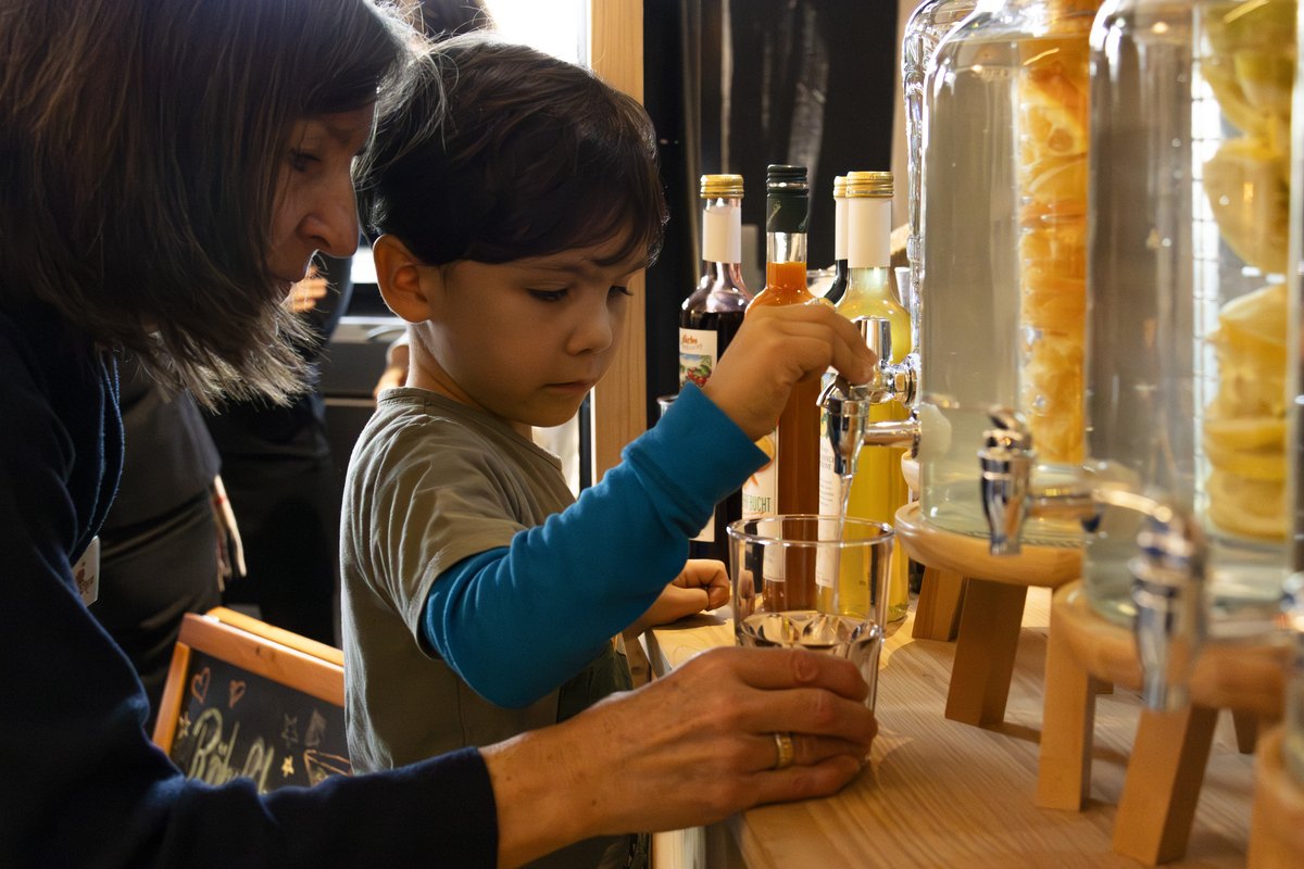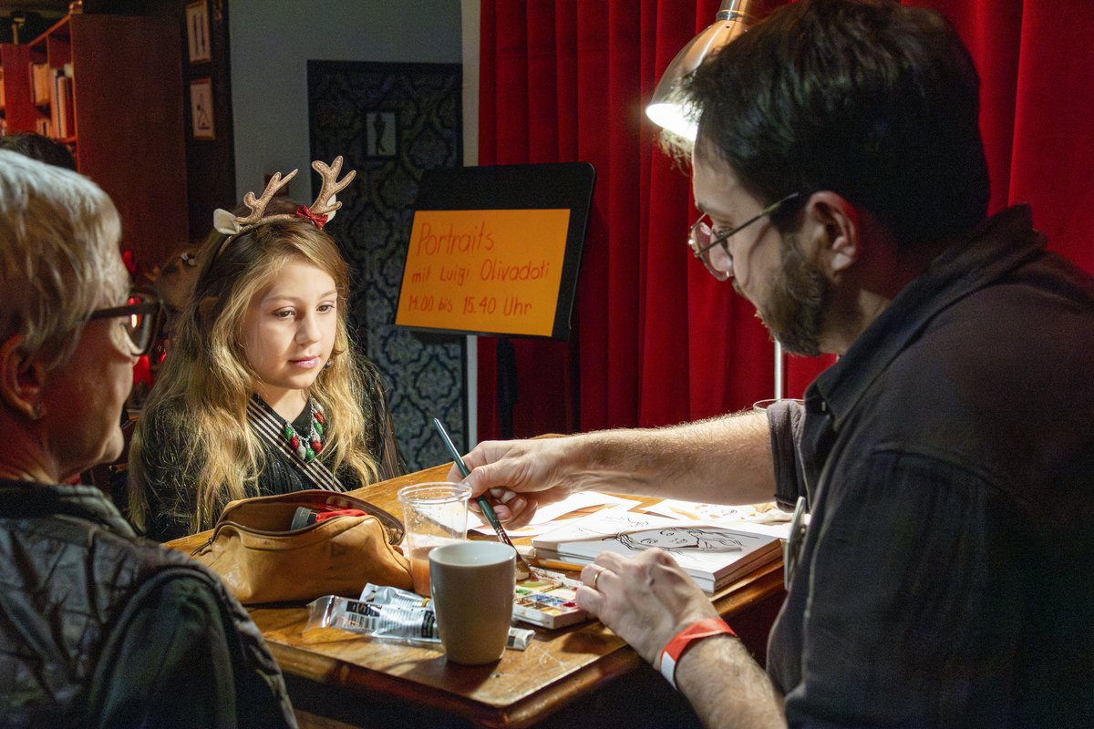 Schon ab 14 Uhr herrschte im Foyer fröhliches Treiben: Bei Kreativangeboten mit Adam Vogt, Eliane Schädler, Luigi Olivadoti und Marie Ruback vom TAK wurde gemalt, gestaltet und Theater gespielt – begleitet von Kaffee und Kuchen und der beliebten Röhrli-Bar mit Hermine Tipotsch.